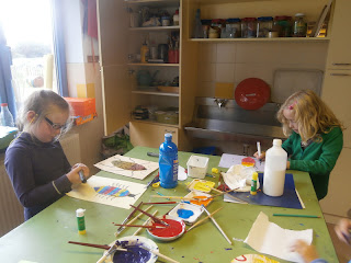 Gisteren namiddag hadden klas 1 en 2 werkwinkels. Er was keuze uit : schelpen maken, raamvlinders knutselen, punniken, haken, bloemschikken, kleien, kevers in karton, theelichtjes in klei, schaken.